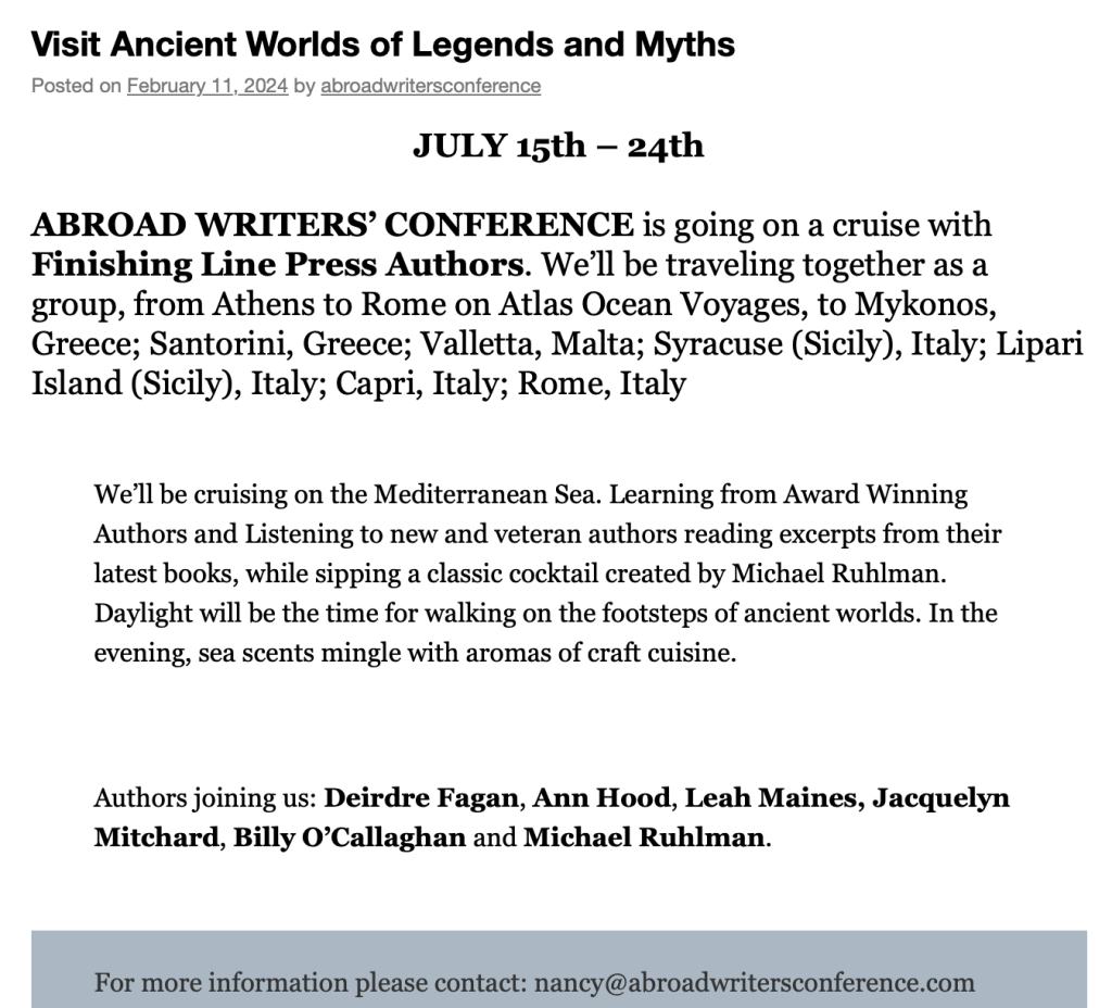 I know this isn’t a bad outcome. I’m good in company with other indie writers over the PR struggle. Yet I feel I must be missing some miraculous key that would break things open. Such thoughts were still spinning through my mind when my publisher, Leah Maines of Finishing Line Press, invited me to read my work this July during the Abroad Writers Conference which will be held on a cruise in the Mediterranean. That did perk me up.